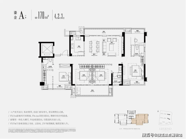 170㎡的产品,四房朝南,算上电梯空间等,得房率高达96%,
