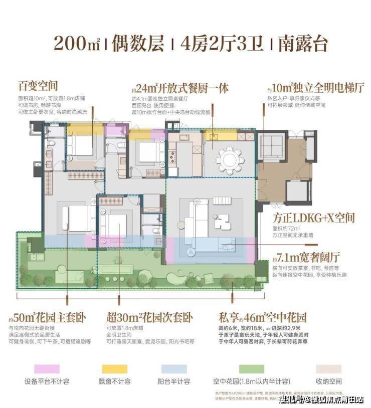 建发灏云通过建筑新规优化,将一部分赠送面积划归户内,实现了更高的户内使用效率。其部分户型得房率甚至达到117%,最高赠送超80㎡的使用面积(如花园/阳台/露台/设备等),实际性价比高于单价显示。