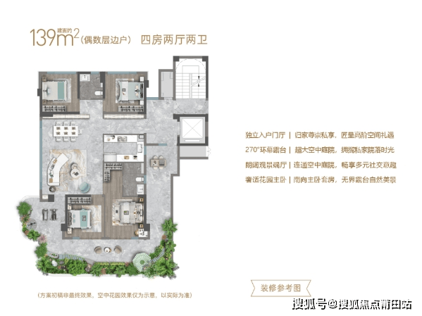 明星户型108平米:虽为入门级,却做到了四室两厅两卫,且采用横厅设计,得房率可观。更重要的是,作为第四代住宅,即便是108平米户型,也能拥有约12平米的空中花园,实现了“家家有庭院”的梦想 。