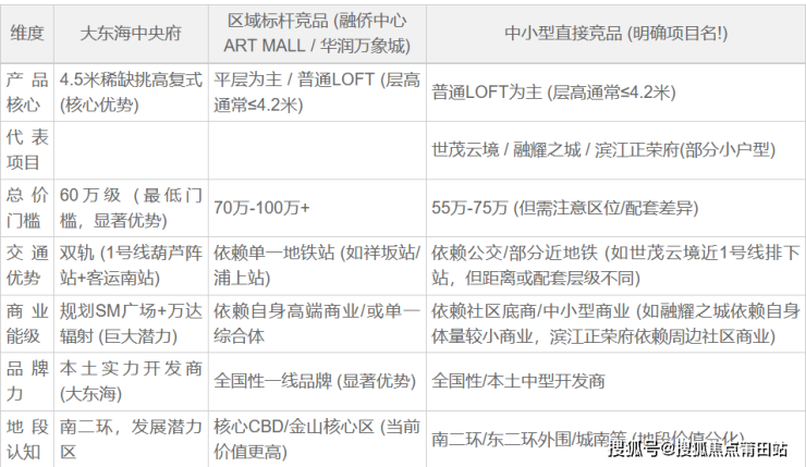 融耀之城 (东二环外围):有小户型LOFT产品,价格有竞争力。主要差异:1) 区位:位于东二环更外围板块,当前城市界面和成熟度可能不如南二环葫芦阵一带;2) 交通:依赖公交或未来规划,无已运营地铁直接毗邻;3) 商业:依赖项目自身及周边社区商业,缺乏区域级大型商业综合体的强力支撑。