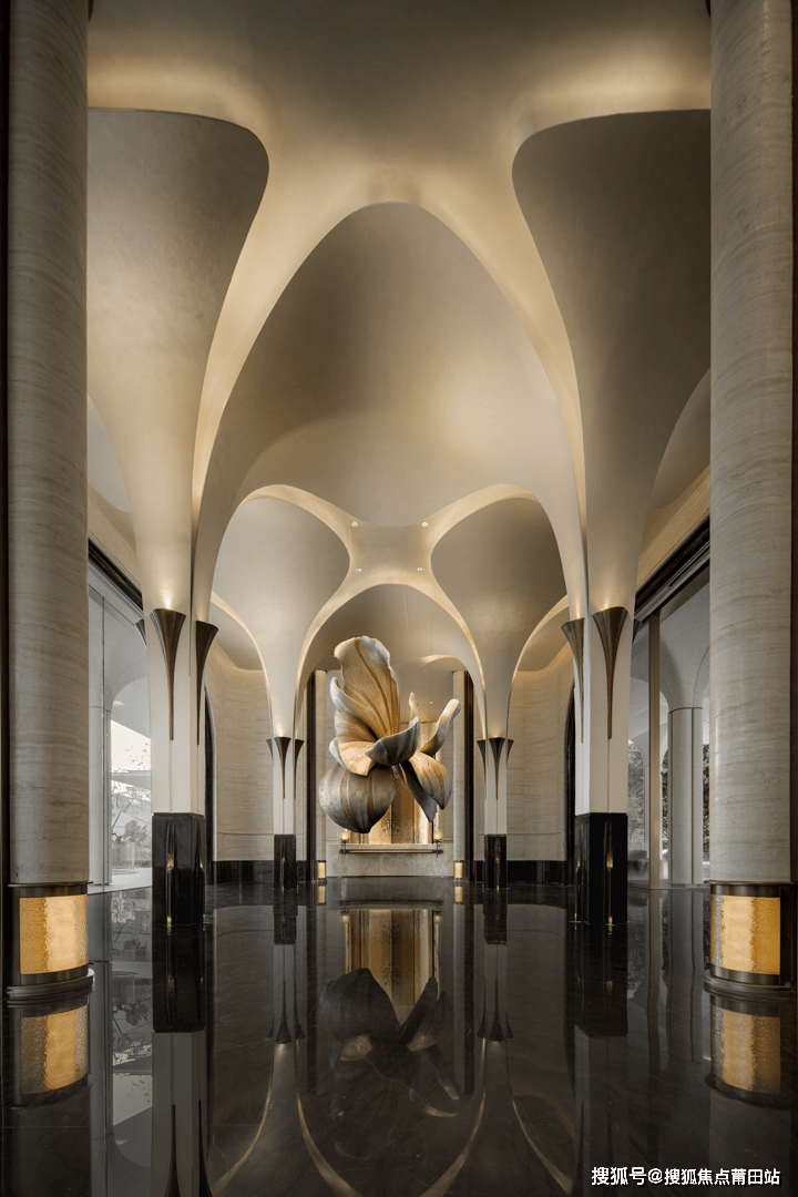 会所地下入口以酒店化标准设计,光厅顶面运用繁复的工艺,打造出如海浪般柔美的曲线造型。增强仪式感的同时,更象征着福州作为海滨城市的独特魅力。