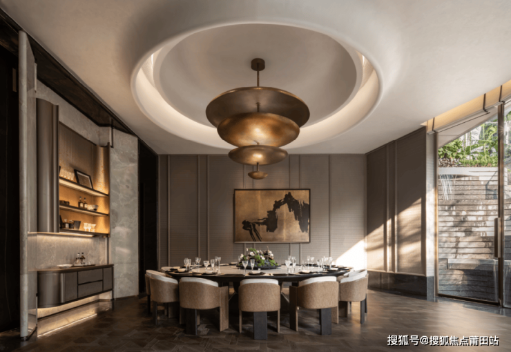 金属光泽的复古装饰在浅色建筑基底上静静绽放。设计以圆的聚合和弧形线条的优雅延展,勾勒出远处隐约可见的建筑轮廓,开阔的结构消除了内外边界限制,将无边水景衔入室内,营造无界美感。