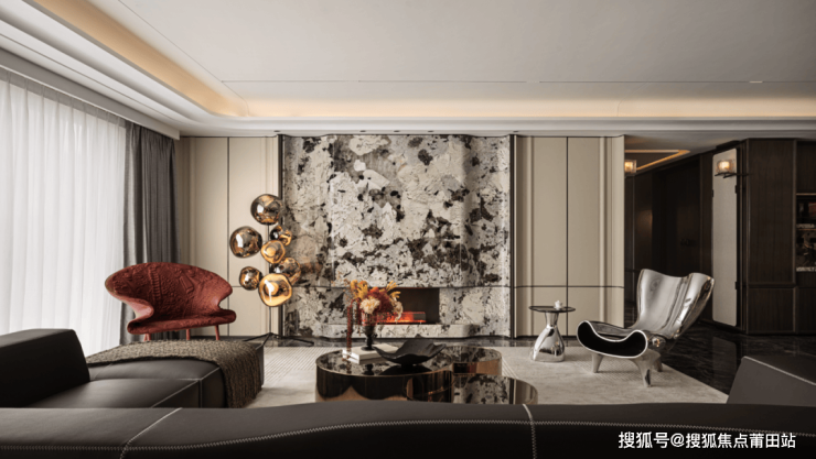 面向心灵的尺度,落地窗景链接到室内,打造舒适愉悦的客厅空间。金属材质的使用赋予了整个空间以现代摩登气息,造型与材质不同的家具让家成为审美场域。
