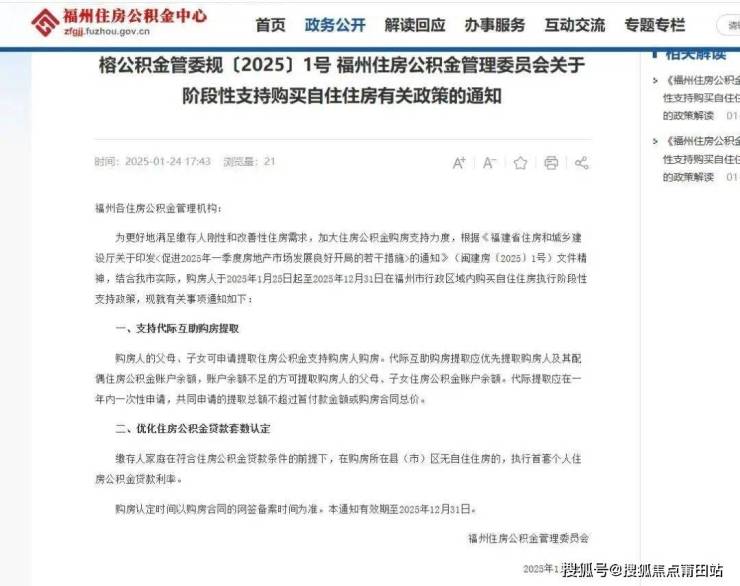 2025年1月24日,福州住房公积金管理委员会发布“榕公积金管委规〔2025〕1号 福州住房公积金管理委员会关于阶段性支持购买自住住房有关政策的通知 ”。