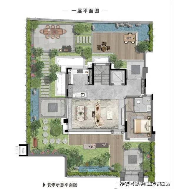 别墅产品以联排排布为主,设计上规避了早前联排产品短面宽、长进深的缺点,采光通风较好。220㎡别墅不算花园和庭院,地下室层高6米,客厅挑高6米,赠送5个花园露台,前庭后院,卧室均为套间,二三层卧室均带情景阳台。