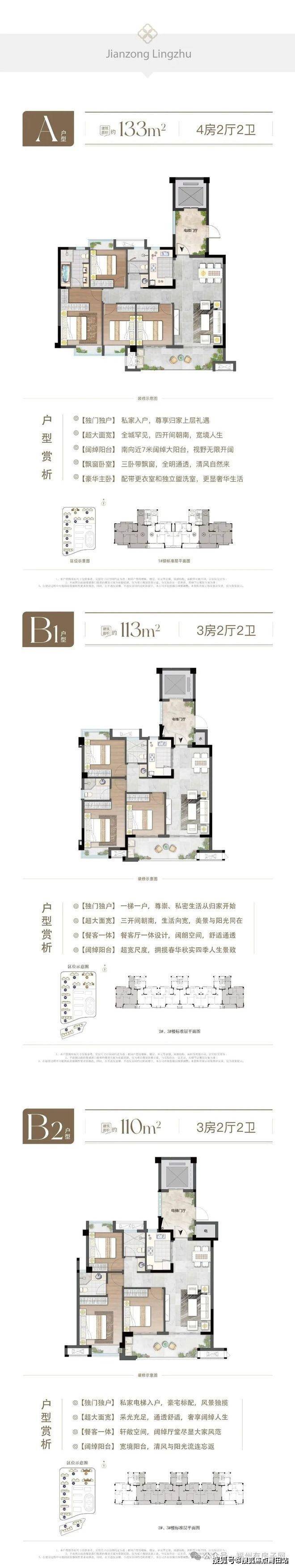 户型对比:建总领筑主打改善型产品,户型设计方正,得房率较高,达到 88% 以上,空间利用率高: