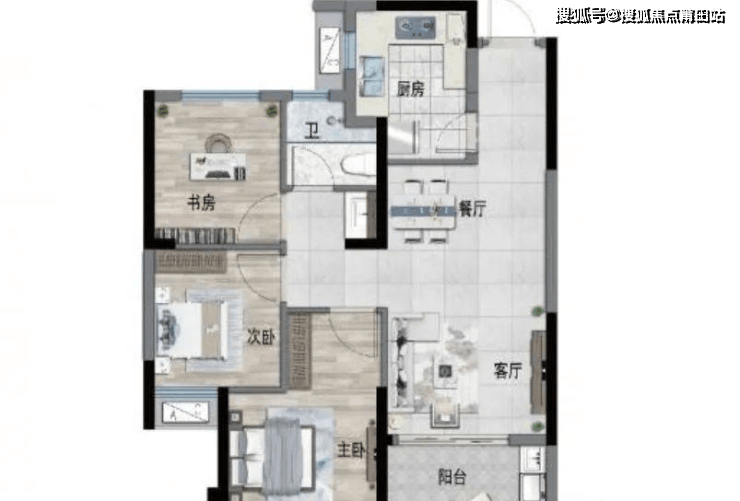 89平米:三房两厅两卫,双开间朝南,位于端头,并非主流布局,纵深大面宽小,客厅墙被主卧门隔断,同时书房空间较小,也是比较老款户型。