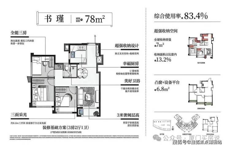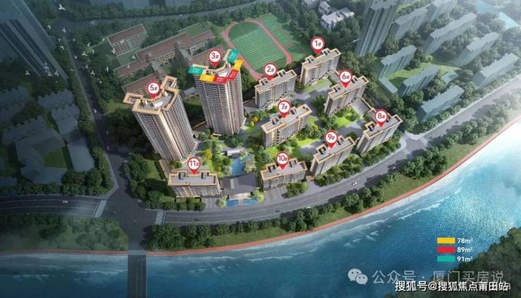 项目位于乐活岛南片区,南向望新垵城中村,与北片区看湾形成差异,但生活便利度毫不逊色。作为刚需+刚改的精准定位,规划2栋高层(两梯三户,实际四梯六户)和8栋洋房,产品涵盖78㎡三房一卫、89㎡三房两卫(类边套)、91㎡南北双阳台三房,得房率高达87%以上。以及100㎡带入户花园洋房,满足不同家庭需求。
