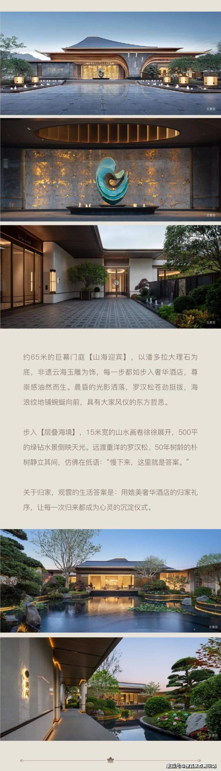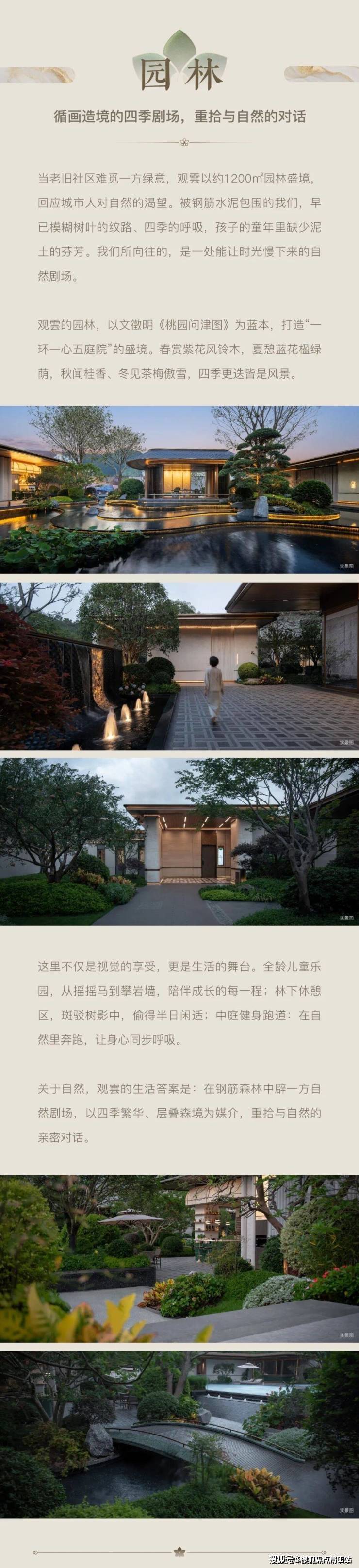约1万㎡中庭园林,以《桃源问津图》为蓝本,打造镜面水景、罗汉松阵列、鱼鳞纹景墙,营造“度假式低密”氛围。