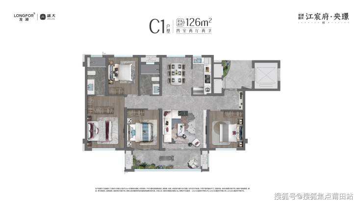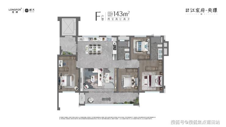 江宸府打造了建面约183㎡的大平层,首创了“空中花园”式入户设计。这一设计不仅极尽奢华,更全方位突破了生活方式的边界,让大平层住出了别墅级的体验。大平层的整体层高约3.1米,标准远超市面上同类型产品。近19米的面宽和四开间朝南的设计,让客厅与三大卧室向阳一字排开,尽显松弛的精神底色。