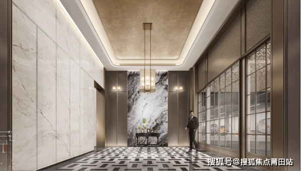 首层大堂配置电动感应门,大堂背景选用大板石材,配置质感软装,凸显入口的精工美学及轻奢的归家氛围感,尽享归家仪式。