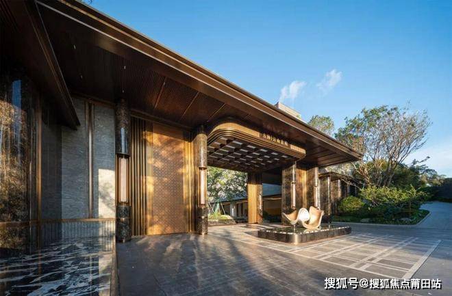 46米宽的大门以安缦酒店同款的浅色波纹板石材打造,两侧是12根巴西进口铂金钻立柱,左右屏风的定制logo包含了“龙鳞纹、鼓山云峰、福州茉莉花”三个元素,福州味满满,寓意富贵、繁荣。