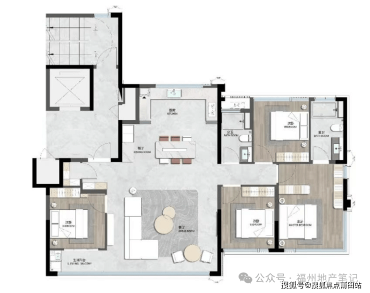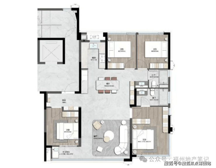 户型类四叶草布局,节省过道面积,空间使用率提高,客餐一体空间视感强。