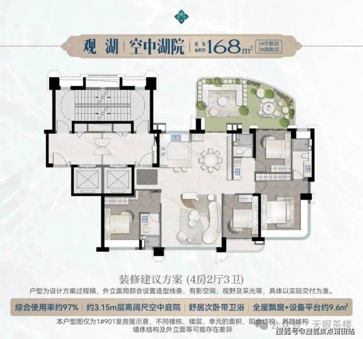 望湖前排是约168-179㎡四代宅,后排是约125㎡洋房,本次1#楼奇偶层四代宅户型如下,所有户型约3.15米层高,几乎超越2024年前所有新盘层高;都是独立电梯入户、南北通透大横厅设计,近0公摊;都是南向5-6开间,3卧室+双套卧朝南;主卧都是270°全景无柱设计,客厅全部出露台;所有户型都有入户花园,次卧有带一个南向阳台...