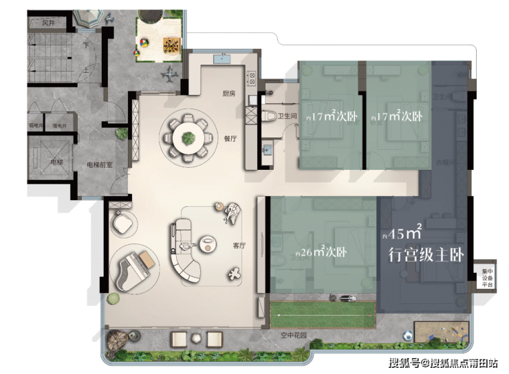 强调庭院与室内空间的互通,南向连接的约18米空中花园,