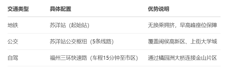 金地自在城位于地铁苏洋站(起始站)前200米,属正地铁盘。2025年福州地铁网络扩展后,苏洋站作为枢纽站,换乘便利性提升(见表1)。