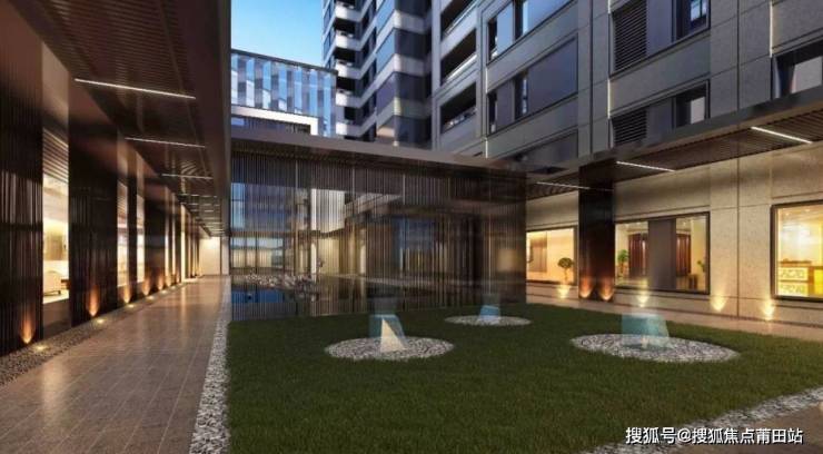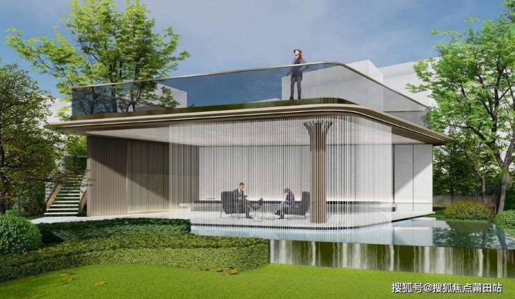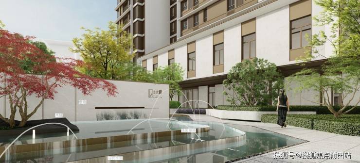 约400M蜿蜒水系,缓缓归堂,水聚而生金。约1050㎡户外休闲空间沐水而立,叠水和鸣,守四时皆景,天人合一。