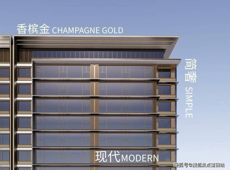 超现代简洁立面,以高级浅灰和香槟金为主色系,搭配高成本造价的香槟金金属型材及全景落地玻璃极致打造,以匠心铸就品质。