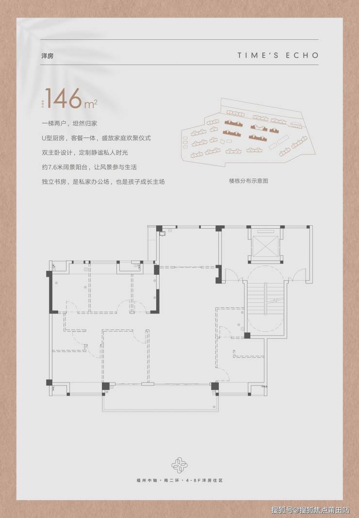 整体规划:现代简约风格立面,规划4-8层95-146平宽景洋房(一梯两户)、160-260平独栋/叠拼以及社区独立商业楼