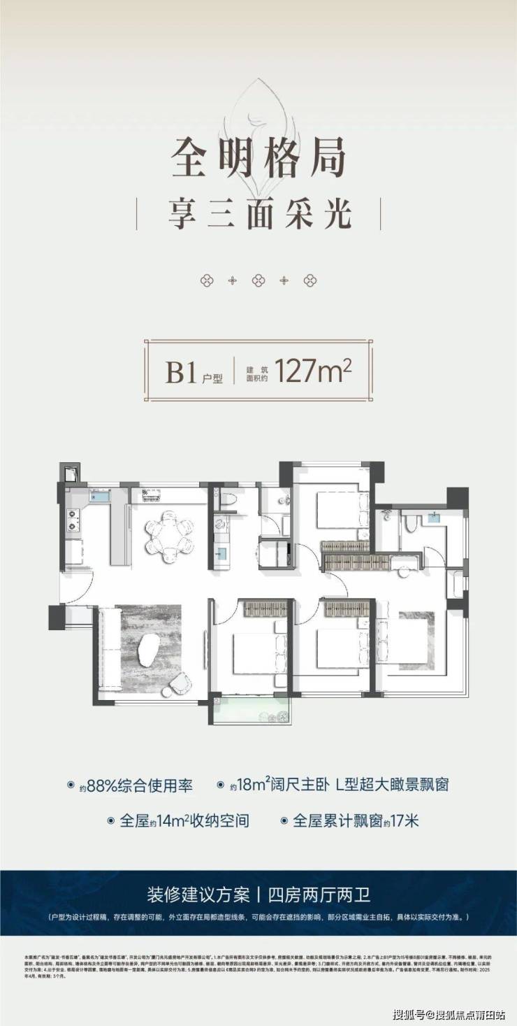 高拓展空间设计:通过可改造的假飘窗、设备平台,实现套内面积最大化,127㎡户型配备双阳台及家政间,空间利用率对标周边143㎡产品;