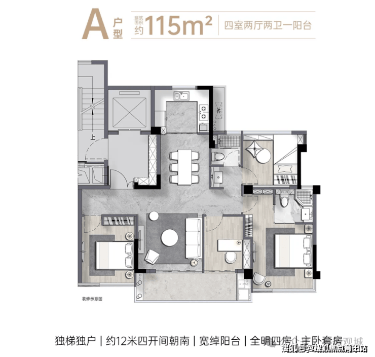 户型产品尺度舒适,独梯独户,得房率高达到95%,四开间朝南,大开间短进深,带大尺度阳台。