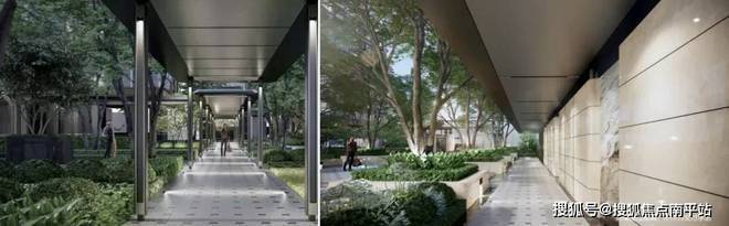 作为社区入口,还与沿街商业和园林景观进行了一体化的设计,为车行、人行及访客的不同需求定制化考虑,以确保进入社区的人都享受到独一无二的定制化归家旅程,如步行归家,可以穿过充满活力的沿街商业,漫步在花园连廊之下,仿佛是一场艺术馆中的漫游……