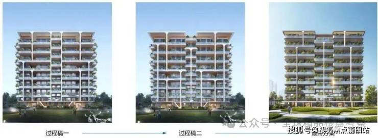 通过对市场上已经出现的第四代住宅方案立面的分析,决定将屋顶造型拉通,造型更整体,山墙面竖向线脚造型简化,增加住户空中花园生活体验。