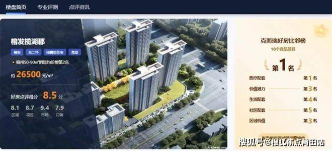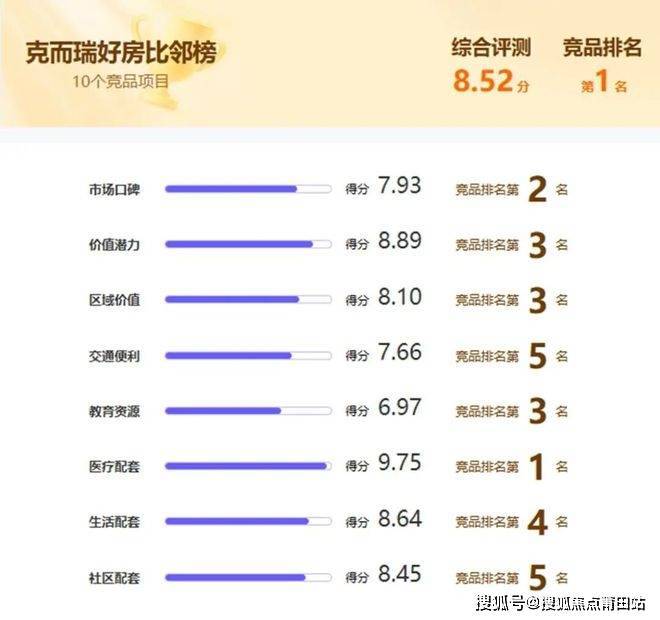 在新一期克而瑞好房点评网比邻榜的评测数据下,更是直观印证了榕发揽湖郡的综合实力:在10个竞品项目的比拼中,项目以8.5的综合评分登顶榜单第1名。各细分维度中,医疗资源以9.75的高分拿下榜单第1名,成为核心优势;价值潜力、区域价值等维度在竞品排名中位列第3;整体来看揽湖各维度发展均衡且核心优势突出,综合实力较优。