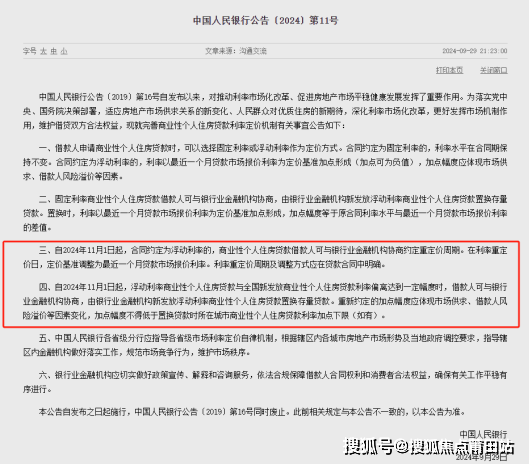 另外,根据公告,对于以浮动利率,也就是贷款市场报价利率(LPR)加减点报价的存量个人房贷,当它的利率加点值高于全国新发放个人房贷利率平均加点值30个基点时,借款人可以向银行申请调整房贷利率LPR加点值,调整后的加点为全国新发放个人房贷利率平均加点值加30个基点。全国新发放个人房贷利率平均加点值为人民银行最新发布的全国新发放个人房贷加权平均利率减去对应季度五年期以上LPR均值。如果所在地区有个人房贷利率政策下限,则最终加点值不能低于所在城市房贷利率加点政策下限。