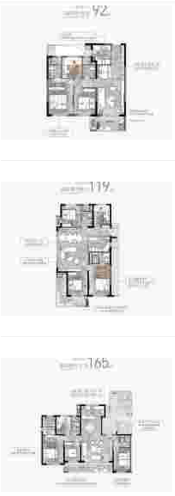 户型面积从92平方米到165平方米不等,满足刚需、刚改及改善型客户的不同需求。每种户型都经过精心设计,空间布局合理,兼顾实用性与舒适度。