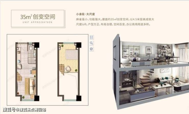 4.5米层高LOFT:35㎡可实现两层实用空间,打造“一层自住+一层办公”的创客模式;