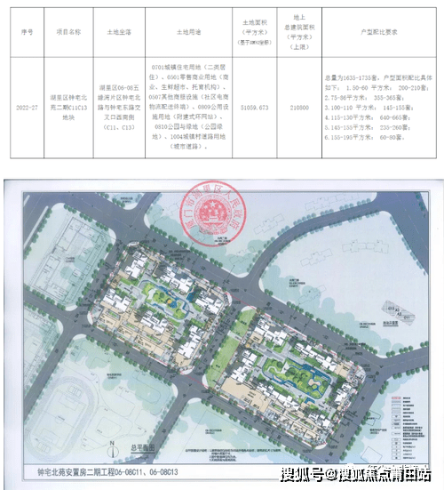 土地面积51059.673㎡,户型规划50-195㎡,户型规划从刚需到复式豪宅配比齐全。总量为1635-1735套,户型面积配比具体如下: