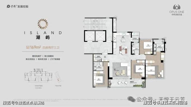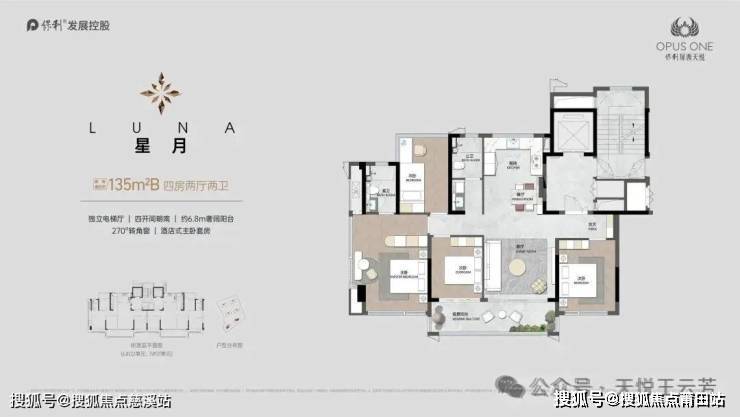独立电梯厅,四开间朝南,约6.8m奢阔阳台,270°转角窗,酒店式主卧套房。