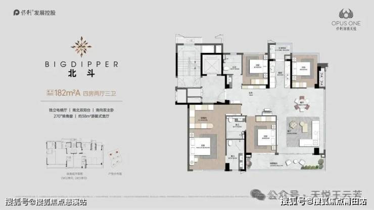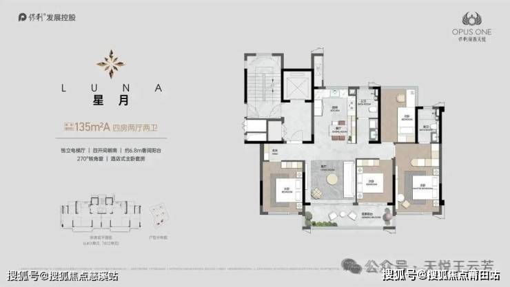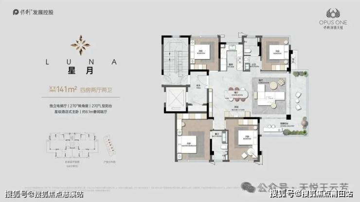 独立电梯厅,270°转角窗,270°L型阳台,星级酒店式主卧,约8.1m奢阔端厅。
