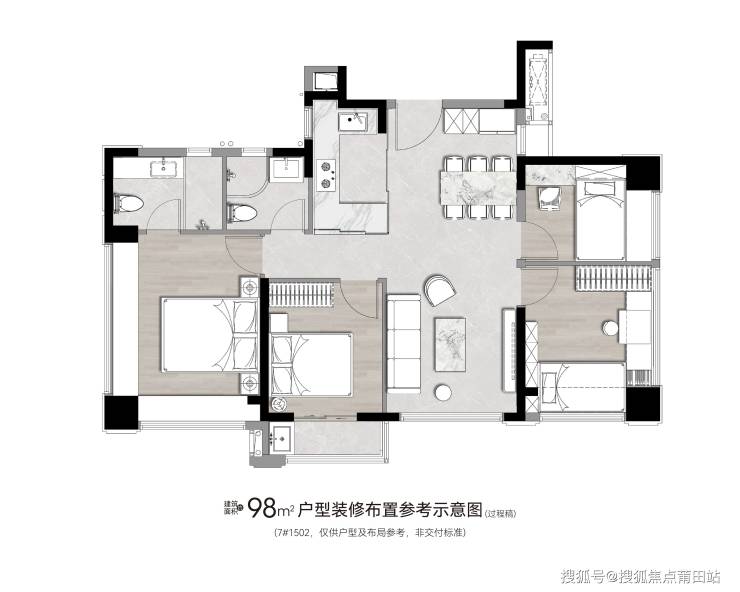 98㎡户型居住品质更优,适合追求舒适度的首改群体。