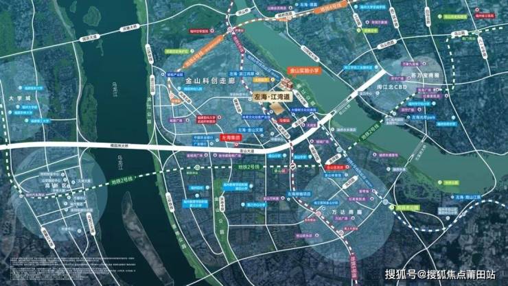 左海·江湾道位于金塘路与金榕北路交叉口南侧,属于金山北部的科创走廊板块。该区域向来是高档住宅的聚集地,分布有旭辉左海岸、融侨水乡别墅、融侨观邸等老牌江景豪宅项目。