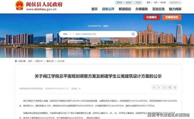 2025年8月8日,闽侯县自然资源和规划局发布“关于闽江学院总平面规划调整方案及新建学生公寓建筑设计方案的公示”。