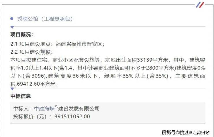 此前中标公告透露,秀映公馆项目业主为福州榕禄房地产有限公司,本项目已完成初步设计及批复,项目投资估算或投资概算金额1300000000元。计划总工期为675个日历天。