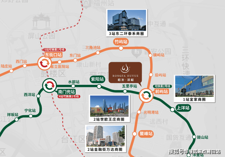 距离2/4号线交汇前屿站,直线距离只有约200米。坐2号线,4站地铁就能达到南门兜。