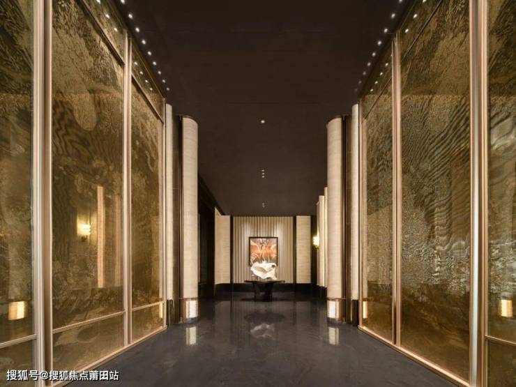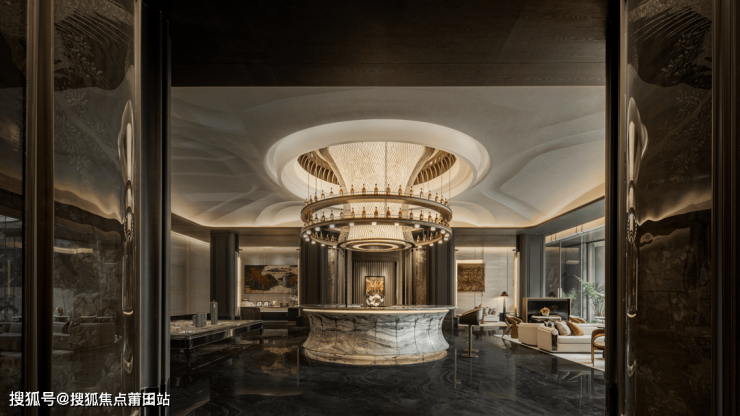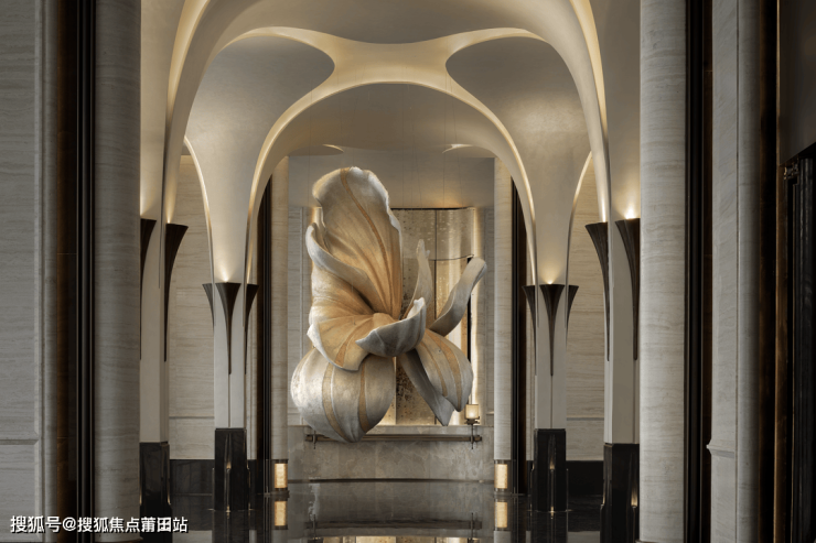 步入前厅接待区,首先映入眼帘的是一座艺术大堂,以极简的设计语言诠释了奢华与优雅。空间顶部以福州传统建筑的“弧形”元素为灵感,构筑充满律动和生命力的曲线造型,柔和的曲线与硬朗的结构形成鲜明的对比,交错的光影营造出层次感,展现出了空间的韵律和自然的和谐美。