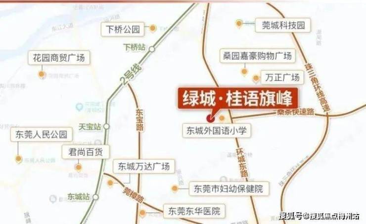 项目位于东城主山片区,距离东莞R2线的下桥站、天宝站约2公里,享东城多个醇熟商圈,南向能望黄旗山脉。