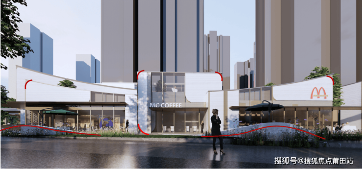 国贸天琴樾的城市界面以福州城的历史文脉为灵感,沿街通过三组店铺的建筑体块形态变化,呼应马鞍墙形态,以内刻弧形带强调马鞍的曲线形态。