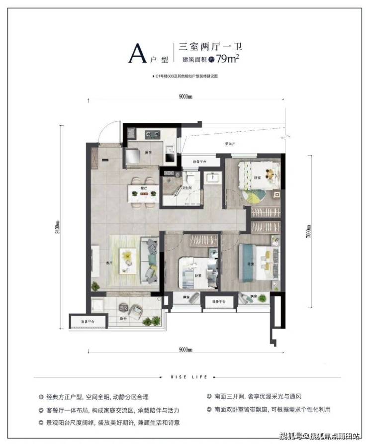 79㎡三房:紧凑实用,三开间朝南,采光通风好,满足三口之家基础居住需求。
