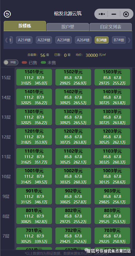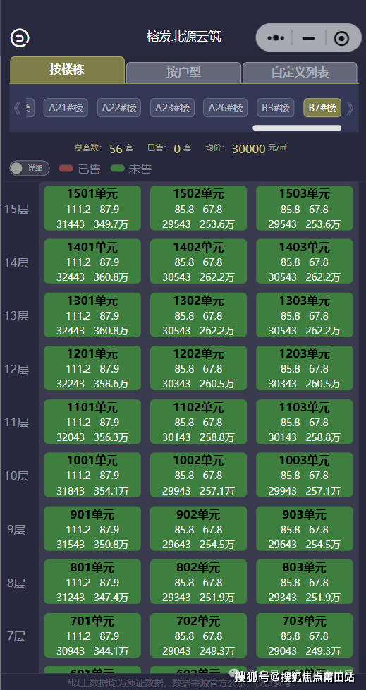 👉榕发北源云筑二期的B3号楼和B7号楼,为15层小高层,底层为架空,两梯四户,整体预售均价为30000元/平。