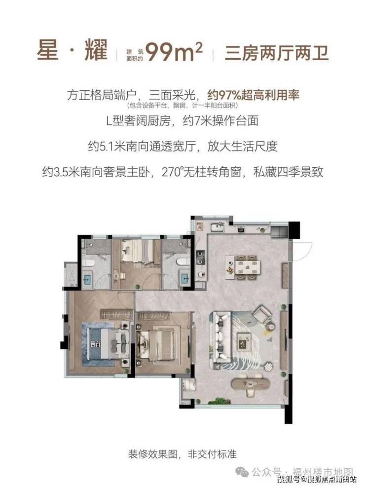 99平三房两厅两卫产品(28套):楼高15层,西端头户型,公摊21%;均价29956元/㎡,楼层差200-300元/平左右,备案区间价格2.78-3.12万/㎡,总价278-312万/套。
