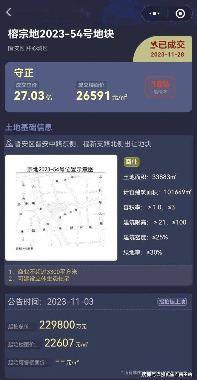 守正地产于2023年11月以27.03亿(溢价18%)竞得榕宗地2023-54号地块,成交楼面价26591元/㎡,地块允许建设四代宅,内部无古建,古庙;西侧为晋安河,东侧有一座庙宇。地块由长乐开发商守正地产竞得后,与建发房产合作,项目由建发操盘。