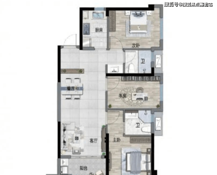 75平米:三房两厅一卫,双开间朝南,75做三房,导致客厅和卧室空间都不大,卫生间也只能做成双隔离,不过小面积三房,同时各空间都有采光,对于刚需而言还是有较大吸引力。