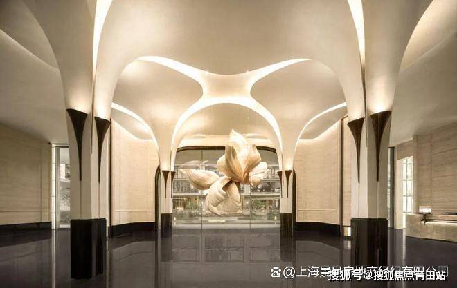 大堂入口雕塑以“白玉兰”为原型,以螺钿镶嵌、罩金、贴箔等工艺呈现,保留花朵廓形和银箔质感的同时,展现了优雅与宁静的意象美学。