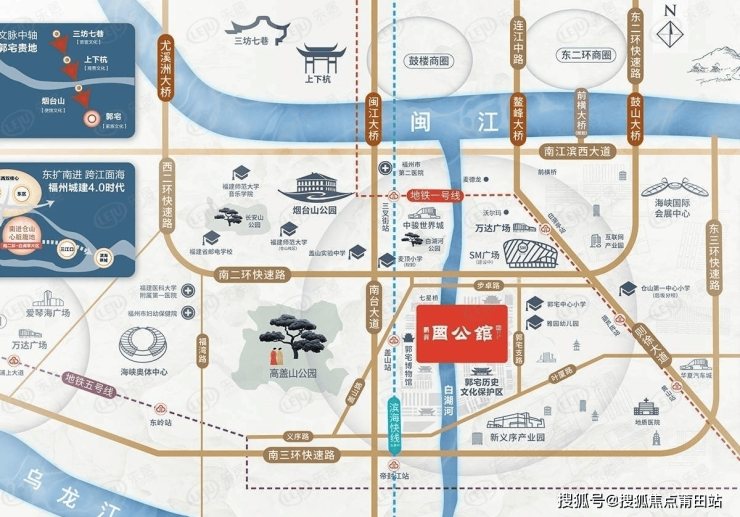 楼盘周边,有公路:三横三纵三桥交通路网(三横:南江滨大道,二环路,三环路;三纵:南台大道,则徐大道,林浦路;三桥:鳌峰大桥,鼓山大桥,前横大桥(规划中)串联城市交通主动脉),毗邻南台大道和则徐大道,靠近二环路出入口,快速通达福州全城 地铁:距地铁1号线葫芦阵站B出站口直线距离700米,与在建滨海快线F1盖山站双轨环绕 公交:距公交站点步卓站直线距离约300米,白湖亭南站直线距离约1公里 ,配套医疗有,直线约3。5公里有三甲医院福州市第二医院,奥体板块的市妇幼医院新院也已经投入使用,周边景观,有高盖山公园,白湖河公园环绕,约3公里即达烟台山公园、则徐广场公园