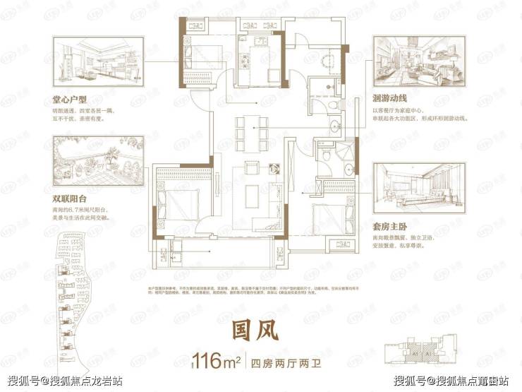 高层-中间套-国风-116平四房两厅两卫,明朗通透,四室各居一隅互不干扰,亲密有度。双联阳台,南向约6.7米阔尺阳台,美景与生活在此间交融。以客餐厅为家庭中心,串联起各大功能区,形成环形涧游动线。南向瞰景飘窗、独立卫浴安放惬意,私享尊崇。